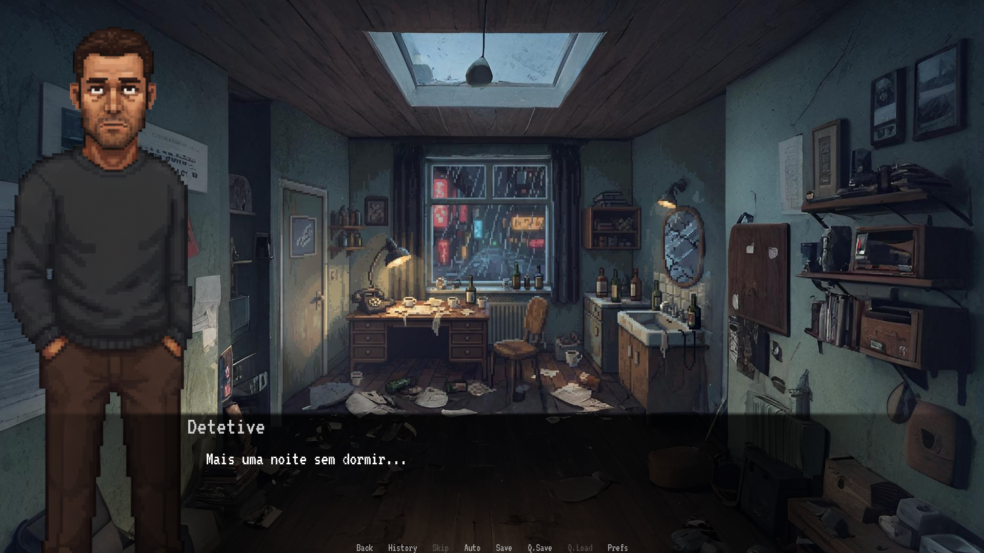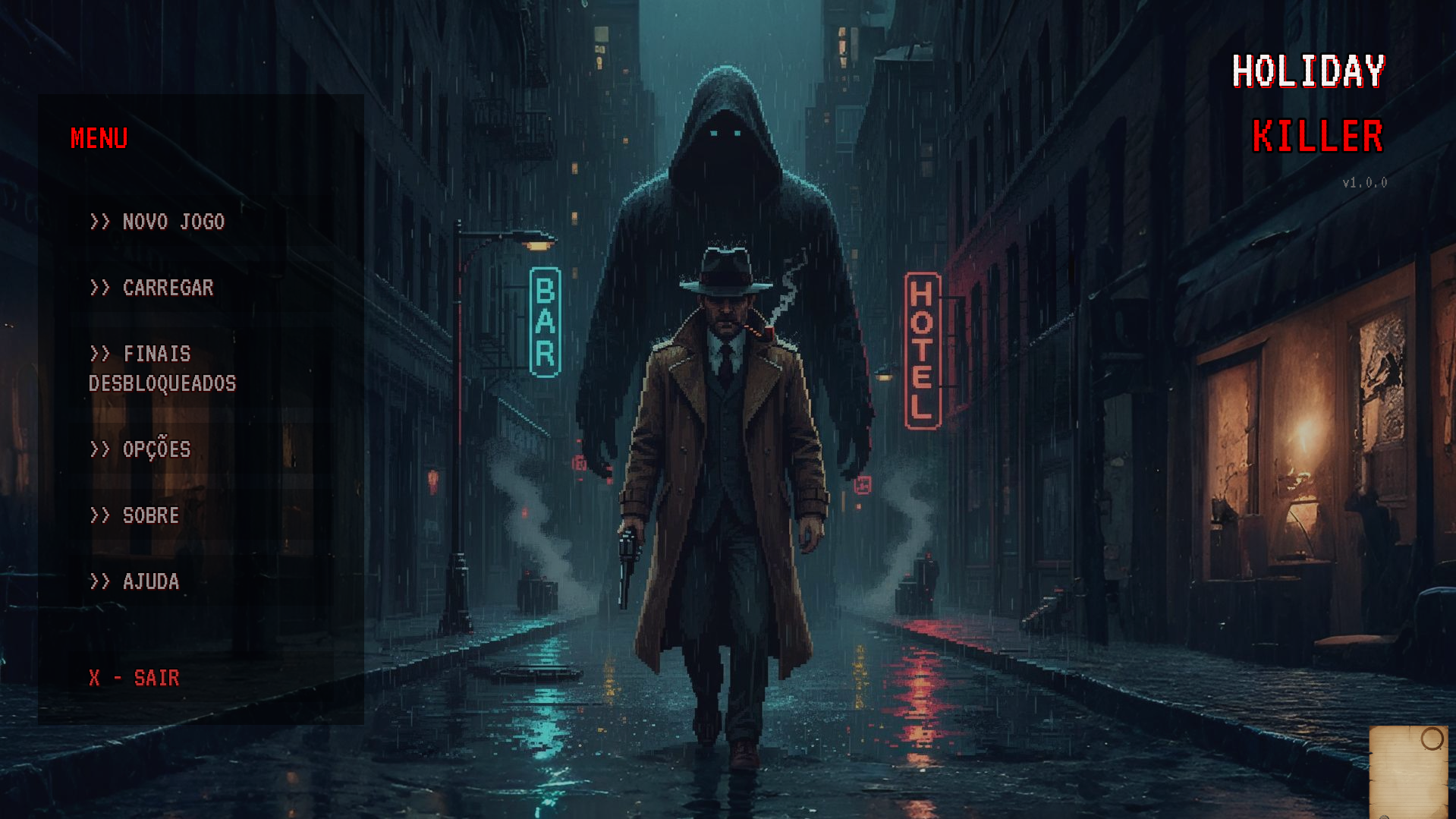 HOLIDAY KILLER é uma visual novel de investigação com estética pixel art retrô onde você enfrenta um assassino que se comunica por meio de cartas criptografadas.